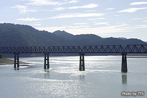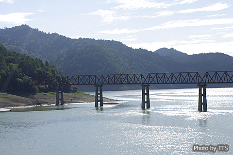 夏の三弦橋例年、8月中旬から9月上旬にかけては大夕張ダムの減水期に当たる。水面からスラっと伸びる橋脚。三弦トラスを 採用した際、橋脚の天端が高く、橋桁を押し出す工程でできるだけ重心を下げて施工をやりやすくしたいという 意図もあったという。そうした三弦橋の姿を思い描きたくて、時期を選んで出かけた。 |