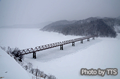 冬の三弦橋2014年3月4日から夕張シューパロダムの管理所がある高台が一般開放されて、誰でも簡単に三弦橋を見に行くことが出来るように なった。そして、これが、三弦橋を見ることの出来る最後のチャンスでもある。 |