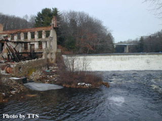 ![]() この落流がグレン・フォールス橋の名前の由来となったグレン滝であろうか。落流のたもとには、おそらくその水力を動力として立地したであろう工場があったが、今では焼け落ちて瓦礫となっている。 奥に架かっている橋が現在のCT-14の橋である。 | |||||||||||
