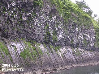 ![]() 不揃いに束ねた鉛筆のように、節理の断面が見えている。 | ![]() 岬の先端の方では上層と下層の節理の方向が崩れて、扇形のように広がっている。 |