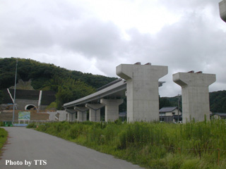 R304を跨いで建設が進む金沢東環状道路。既に橋桁が渡してあるあたりをR304が横切っている。上の完成予想図にもあるように、金沢東部環状道路とR304とは直接行き来できない。