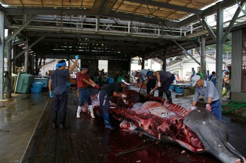 調査捕鯨は資源管理の下に行なわれているため、解体に先立って体長などの計測が実施される。調査は 解体途中でも随時行なわれていた。 |