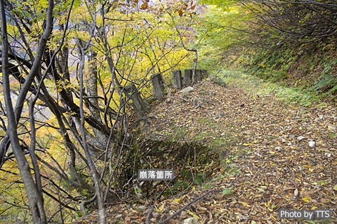 さらに行くと、谷側に縁石が並んでいるところにたどり着く。コンクリート製の縁石に 金具がついていることから、ガードレール様になっていたのだと思われる。 こうした縁石が設けられるということは崖が厳しいということでもあり、実際 一部崩落している箇所もある。 |