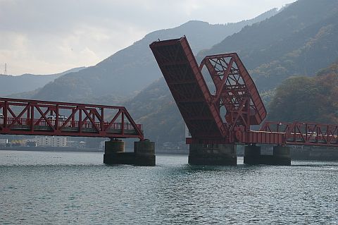 13:03 長浜大橋 日本最古の可動式道路橋(バスキュール式鋼鉄製開閉橋)として昭和10年に建設された。