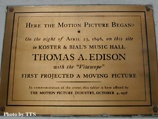 このデパートの34丁目に面した壁面に1枚のプレートが掲げられているのは、観光客だけでなく地元ニューヨーカーでも知る人はいないだろう。Macy'sという店名のプレートの上に掲げられているプレートには、"Here Motion Picture Began (映画発祥の地)"と書いてある。 |