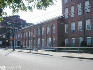 パターソン博物館の横の道を少し坂を登るように歩いていくと、ビジターセンターがある。大滝とは目と鼻の先まで来ているが、ビジターセンターに立ち寄って地図や資料などをもらう。博物館は展示物中心で、どちらかというと町歩きにはこのビジターセンターでもらえるパンフレット類が有用だ。 現在、大滝を中心にしたかつての工場街(パターソン博物館も含む)はThe Great Falls National Historic Landmark Districtに指定されていて、景観の保全が図られると同時に、見学順路の設定や案内看板の設置などの観光客への配慮もなされている。 ビジターセンターのある三差路を左に折れ、大滝の展望台へ向かうようにしていくと、程なくパッセイク川に出会う。大滝の上流にあたり堰が作られている。ここから水路に水を引き込んでいた。水路は現在では使われていないが、水力発電所を動かす為の水を取り入れるための堰として現役である。 |