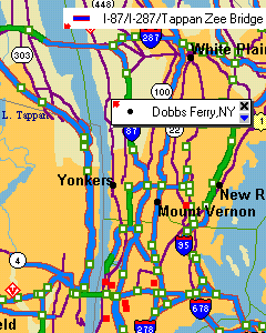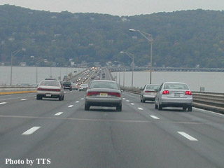 ![]() タッパン・ジー橋ニューヨーク市の外郭環状線を形成するI-287がハドソン川を越えるのが、タッパン・ジー橋である。この橋はI-87とも重複になっていて、マンハッタンから北上して行くとハドソン川を渡ったところで有料道路のニューヨーク・スルーウェイとなって、州の北部のオルバニーやさらにはカナダのトロントまで通じている。オルバニーで分岐して、シラキュースやバッファロー、ナイアガラの滝まで行くこともできる。いわばニューヨーク市の北の玄関口に相当する橋である。
