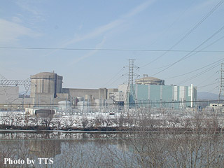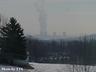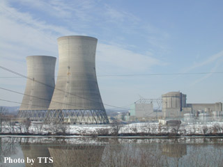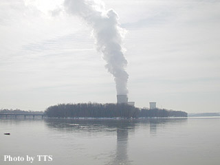 巨大なとっくり型の塔がスリーマイル島原発のシンボルのようになっているが、これらは冷却塔で、立ち上っている煙も水蒸気である。臨海部に立地して海に廃熱している日本の原子力発電所では見ることのない施設である。 |