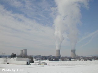![]() サスケハナ川を渡るペンシルヴァニア・ターンパイク(有料の高速道路)の橋の上からも西向きの場合は左手(東向きの場合は右手)に、スリーマイル島原発の「とっくり型」の冷却塔を望むことができる。特に冬の日は、現在も稼働している1号機の冷却塔から水蒸気が空高く登っているのが目に付く。直接近くに立ち寄らなくても、ペンシルヴァニア・ターンパイクを東西に移動中に目撃している人もいるはずである。